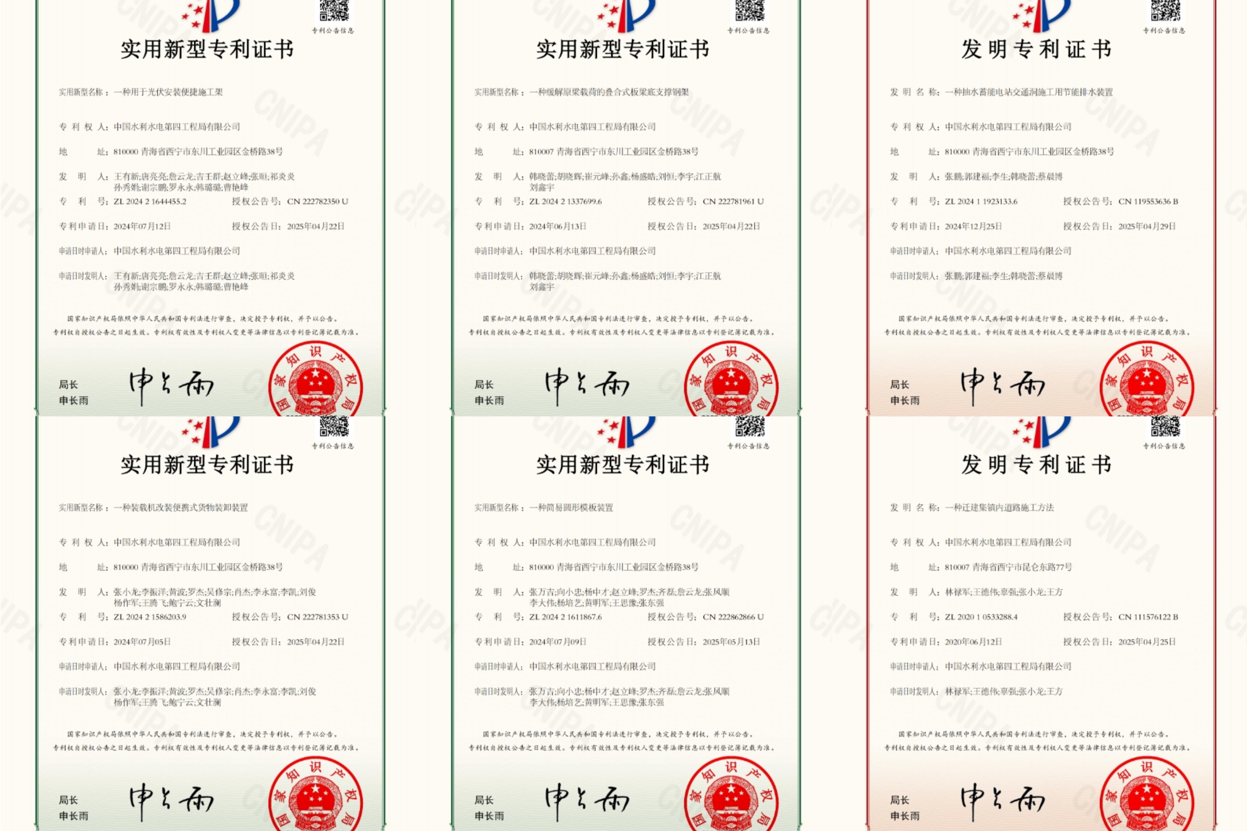 近日,第三分局獲得國家發(fā)明專利2項、國家實用新型專利4項。其中,《一種遷建集鎮(zhèn)內(nèi)道路施工方法》、《一種抽水蓄能電站交通洞施工用節(jié)能排水裝置》獲得國家發(fā)明專利,《一種緩解原梁載荷的疊合式板梁底支撐鋼架》、《一種裝載機改裝便攜式貨物裝卸裝置》、《一種簡易圓形模板裝置》、《一種用于光伏安裝便捷施工架》獲得國家實用新型專利。